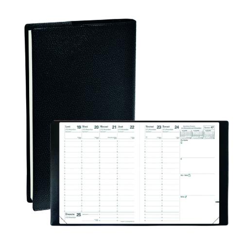 Agenda semainier de bureau.  Grille 1 semaine sur 2 pages. Couverture plastique Impala grainée. Reliure cousue. Papier vélin blanc 85 g certifié PEFC / 10-31-714 et recyclable.